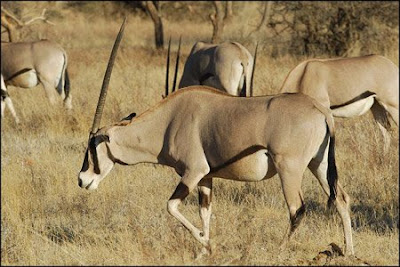 Oryx is one of three or four large anteloper species of the genus Oryx, typically having long straight almost upright or swept back horns. Two or three of the species are native to Africa, with a fourth native to the Arabian Perninsula . Small populations of several oryx species, such as the "Scimitar Oryx", also exist in Texas and New Mexico, USA as captive populations on wild game ranches.The Hebrew word re' em may refer to the Arabian Oryx, although this word could also refer to the extinct Aurochs, or some other type of horned mammal. In the King James version of the Bible the word “re’em” is translated as “unicorn", and the legend of the Unicorn may have originated in part from the Arabian Oryx, which when seen in profile frequently appears to have only a single horn.